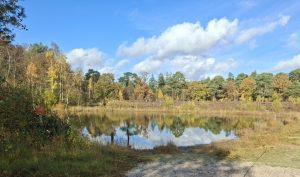 Onderweg hebben we lunchpauze gehouden op een mooie open plek. Het was warm en onze jassen konden uit. Daarna weer verder gewandeld over slingerende paadjes. Bij de Wasch Kolk, waar vroeger de schapen gewassen werden, hebben we ook even stilgestaan om te genieten van het mooie verstilde landschap. Daarna vervolgden we onze route door naald- en dennenbossen. Weer een heel ander bosgebied. De paden waren hier goed zichtbaar (geen bladeren).